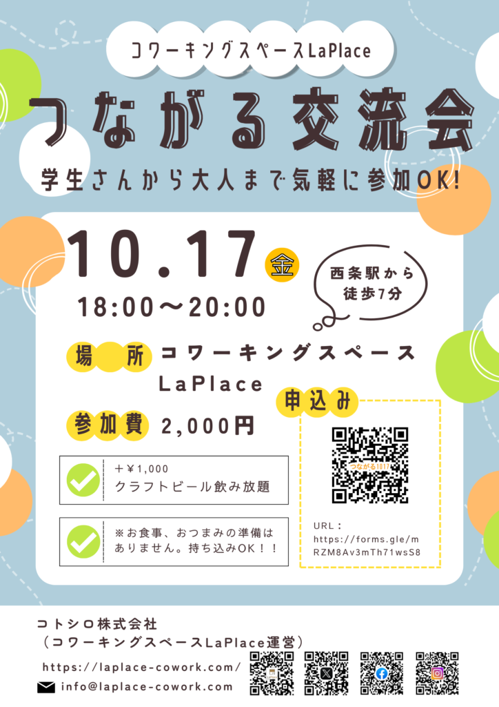 セミナー・イベント情報/その他/交流会 【終了】251017 つながる交流会 2025年9月22日 by staff@lp 2025.10.17(金)開催 「つながる交流会」コワーキングスペースLaPlaceで開催する交流会です。普段利用されている方はもちろん、コワーキングスペースって、シェアオフィスってどんなところかな?という方も、ぜひのぞいてみてください! 日時:10月17日(金)18:00~20:00参加費:2,000円(120分クラフトビール飲み放題は別途1,000円)飲食物の持ち込み自由です。※当日お食事などのご用意はございません※申し込みはこちらのフォームから LaPlace, おしらせ, つながる交流会, ビール, リモートワーク, 事業, 交流会, 東広島, 西条, 酒