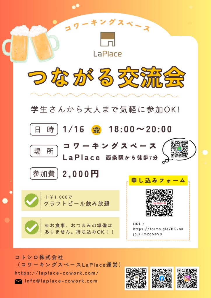 お知らせ/セミナー・イベント情報/その他/交流会 260116 つながる交流会 2025年12月25日 by staff@lp 2026.01.16(金)開催 「つながる交流会」コワーキングスペースLaPlaceで開催する交流会です。普段利用されている方はもちろん、コワーキングスペースって、シェアオフィスってどんなところかな?という方も、ぜひのぞいてみてください! 日時:1月16日(金)18:00~20:00参加費:2,000円(120分クラフトビール飲み放題は別途1,000円)飲食物の持ち込み自由です。※当日お食事などのご用意はございません※申し込みはこちらのフォームから LaPlace, おしらせ, つながる交流会, ビール, リモートワーク, 事業, 交流会, 東広島, 西条, 酒